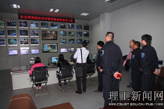 考评组查阅了综治工作台账,观看了新生2013新生消防安全教育和应急疏散演练视频,重点检查了综合实验室、汽车碰撞实验室、计算机实验中心、图书馆等重点部位的消防系统配置情况,并对实验室的监控系统表示肯定;关注学生食品安全,对我校学生食堂的卫生情况表示满意;仔细了解学校的监控设备、报警点配置情况,并通过在监控中心调取的监控录相了解学校的监控流程;对学生寝室的门禁系统表示赞许;对化学学院危险品管理仓库进行了检查;在图书馆自修室对学生做了问卷调查。