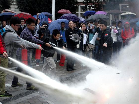 首先,保卫处副处长伍接朝作了题为《关注消防 珍爱生命》的消防知识讲座,他结合学校的实际情况,用身边的案例和详实的数据,从火灾的危害、火灾的预防、发现火灾如何处置、火场逃生与自救四个方面介绍了大学生应掌握的相关消防知识。接着,消防专家在讲座现场组织了疏散逃生演练,当会场模拟浓烟滚滚、拉响警报后,同学们在消防专家及保卫干部的组织下,匍匐弯腰,手拿湿毛巾或戴防毒面具,有序的撤离会场。最后,消防专家在文化广场组织了灭火演练,当火堆点燃后,同学们纷纷提起灭火器或水枪,冲向火堆感受灭火过程。