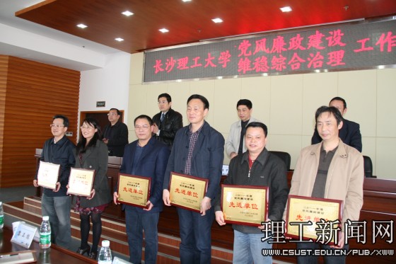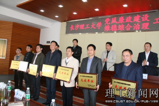 会议对获得2011年度全校党风廉政建设先进单位的土木与建筑学院、经济与管理学院、水利工程学院、城南学院、继续教育学院、图书馆等6个单位进行了表彰;对文法学院、交通运输工程学院、土木与建筑学院、水利工程学院、能源与动力工程学院、继续教育学院、机关党委等7个“社会治安综合治理先进单位”和高顺利等37人“社会治安综合治理先进个人”进行了表彰。