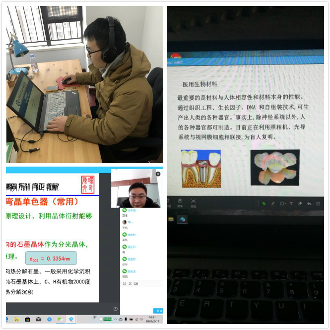 科研办结合省学位办《关于做好疫情防控期间研究生教学及有关工作的通知》、2025年新澳门原料网站《关于新型冠状病毒感染的肺炎疫情防控期间做好教学、科研等有关工作的通知》等文件精神,第一时间发布了《材料科学与工程学院防控新型冠状病毒肺炎期间研究生教学通知》,考虑到老师们在教学过程中要随时熟悉相关政策和文件精神,学院也收集了疫情防控以来国家、省、教育厅、学校、学院发布的各类文件和通知,并进行了整理汇编,形成了《材料科学与工程学院疫情防控期间研究生教学文件汇编》,让老师们学习执行。分管科研与研究生培养工作的副院长范金成以学生为中心,全面摸排,同时加强心理辅导,给予有困难学生和应届毕业生特别关注。分管教学的副院长陈曙光以他极高的专业素养及前瞻性,迅速做出反应,通知当天就建好《材料结构表征》腾讯课堂,19级同学在班长周润恺的带领下选好课并和陈老师积极沟通,通知当天建好课程微信群。周哲博士和徐协文老师紧接着也分别做好《新型炭材料》和《材料制备与加工技术》课程线上教学的相关工作,使得研究生线上课程教学工作顺利推进。