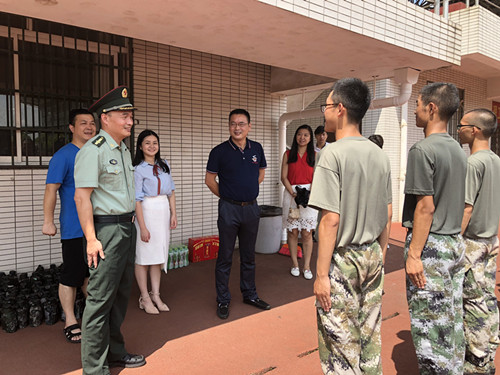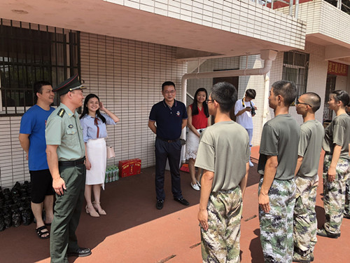 8月30日上午,材料学院党委书记张国强,党委副书记唐青,党政办主任张凌及辅导员谢易真、陈鑫林一行人来到训练场,慰问正在集训的教官们。