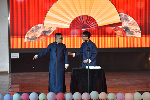 唐青代表学院给大家送上了最美好的节日祝福,也希望同学们能够斗志昂扬,圆满的完成军训任务,给大学第一课交上一份最满意的答卷。联欢会在GLC街舞社的充满青春活力的开场舞中拉开了序幕,19级新生们带来的歌曲串烧《成都炸鸡》获得了场下的阵阵欢呼;阳光艺术团模特队气场十足的模特秀让大家大饱眼福;叮咚如泉的吉他声与清纯如天籁的歌声,交织成一片美丽画面;学院文工团表演队的相声《说聋哑》更是让现场笑声掌声不断。在以“花好月圆夜”为关键词的歌曲接力游戏中,大家纷纷化为中华小曲库发掘各种流行歌曲、军歌甚至儿歌更是将全场的气氛推至一个高潮。中秋节还恰逢新生刘庆涛同学的生日,学院特意准备了生日蛋糕,全体同学一起齐唱生日歌给他送上了最真挚的祝福。最后的成人礼环节,新生全体起立,握起右拳庄严宣誓,一声声铿锵有力的呐喊,一句句掷地有声的誓言,表明了自己的决心。