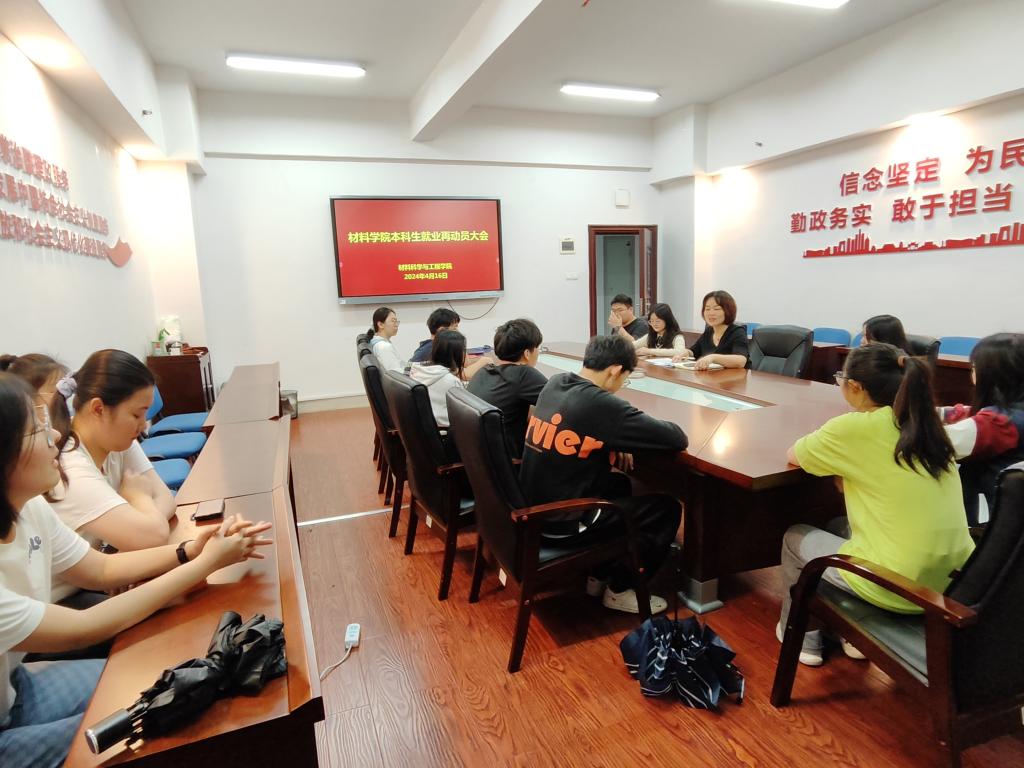 4月16日,材料学院在新能源一号楼307召开本科生就业再动员会议,旨在进一步推动本科生的就业工作,确保每一位学子都能顺利踏上人生的新征程。学院党委副书记邵巧艳、就业专干谢易真及未就业本科生参会。