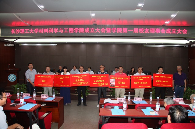 校友与社会合作处张美红处长宣读材料学院第一届校友理事会成员名单,并宣布材料学院第一届校友理事会成立。佛山陶瓷校友分会会长、学院第一届理事会会长张坤林同志讲话,他表达了校友们对学院成立的欣喜之情,祝愿材料学院蓬勃发展。为纪念学校办学六十周年暨材料学院成立,广东金东海集团、岳阳慧璟新材料有限公司、广东佛山陶瓷校友会、硅酸盐工程专业校友、无机材料专业校友、硅酸盐工程九班、十班以及87届硅酸盐工程专业校友谭金山总计向学校捐赠基金近130万元。