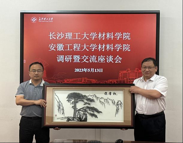 随后,安徽工程大学材料学院赠送学院一幅珍贵的芜湖铁画,铁打的迎客松,象征着两校材料学院的友谊万古长青,继续保持深入合作,共同发展进步。