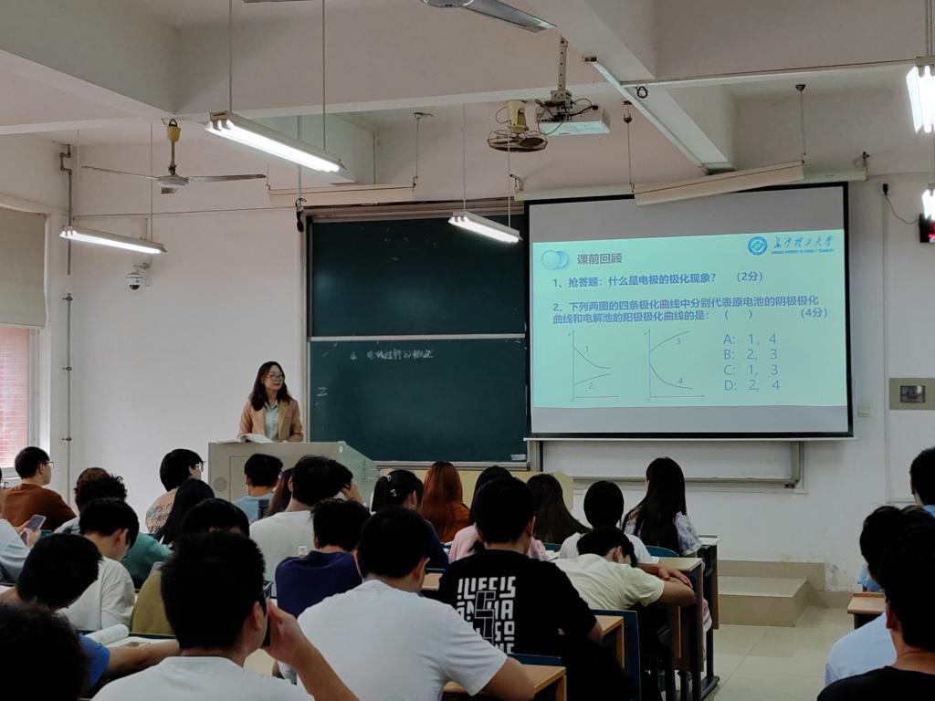 张怡琼此次课程中采取问题引入、知识点讲授的引导式教学方法电化学的基本概念出发,电极反应的极化现象、电极过程的基本例程和速度控制步骤、电极过程的特征等专业知识点与科研实践中的应用结合起来激发学生们的自主分析问题理论联系实际的能力。同时,把课程思政元素有机融入课程中,将所学的专业知识应用到社会实践各领域,进一步提升了同学们对知识的实践运用能力激发学生的爱国情怀社会责任感实现应用型复合人才的培养。课程最后,张怡琼通过梳理总结本堂课的重点、难点,鼓励学生在科研中夯实基础,培养务实求真勇于开拓创新的科学态度,遇到问题能迎难而上、勇攀科高峰