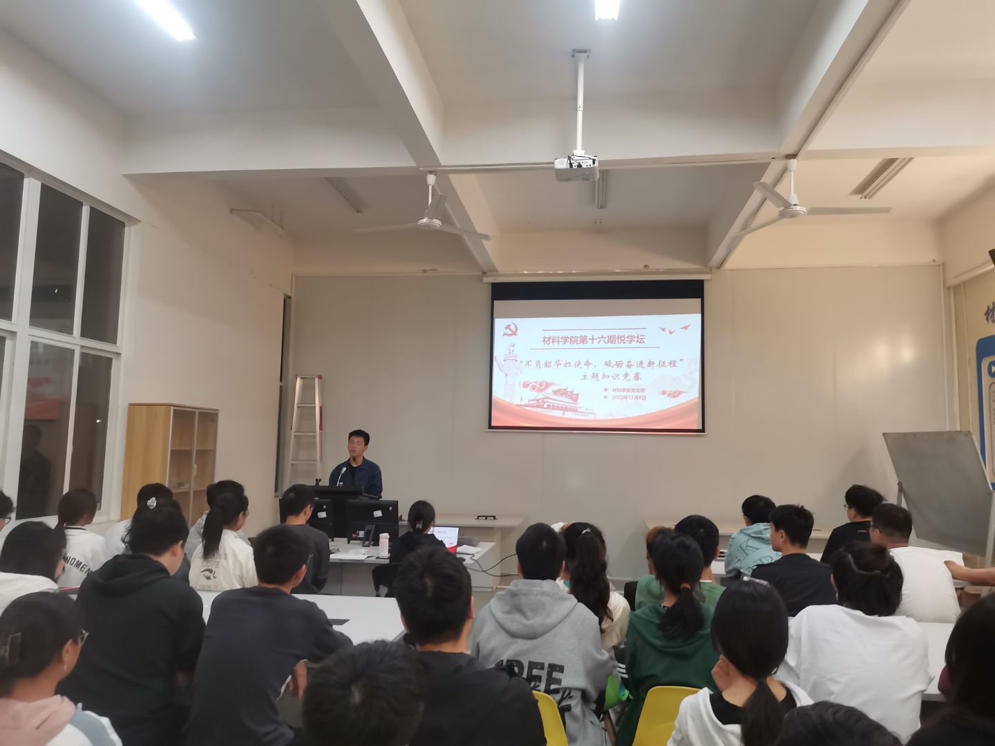 11月8日晚,材料科学与工程学院本科学生党支部于新能源三号楼B107号会议室举办第十六期悦学坛常态化学习活动,本次悦学坛学习活动以“不负韶华担使命,砥砺奋进新征程”为主题的二十大知识竞赛形式呈现。预备党员龙之彤主持了这次比赛,46名入党积极分子和2名发展对象参加了本次比赛。