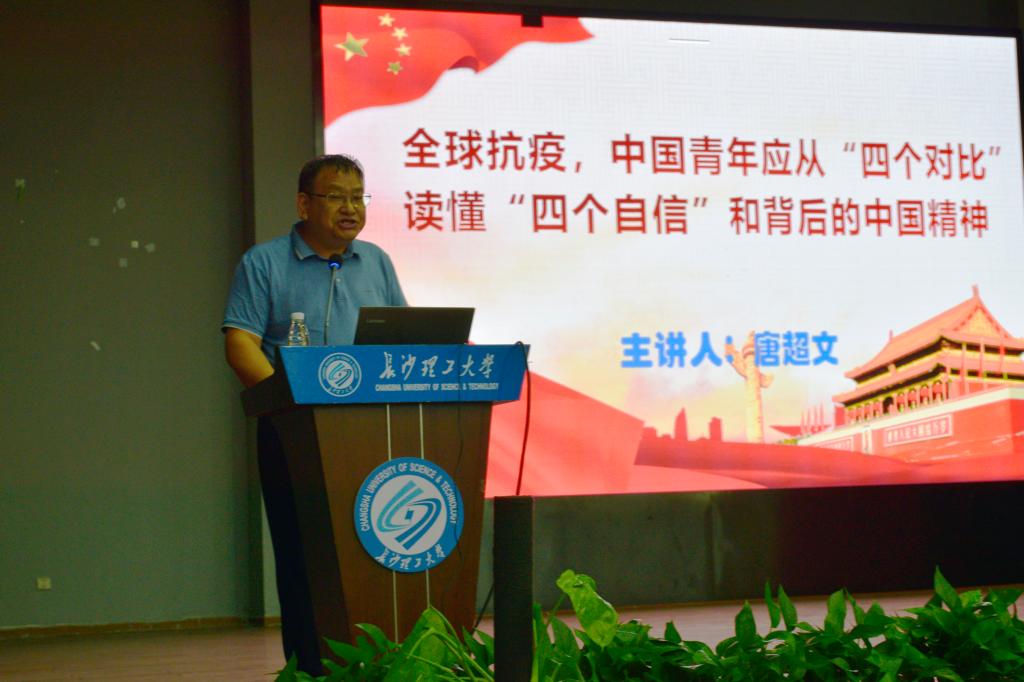 唐超文书记从五个方面进行了阐述,首先,我们要有“只有中国特色社会主义才能发展中国”的道路自信,我们坚持以人民为中心、坚持问题倒逼改革和坚持党是领导一切,我们的道路才能越走越宽广、越平坦和越坚定。其次,我们要有“新时代呼唤新思想,新思想引领新时代”的理论自信,从全球抗击新冠疫情的角度,我们的国家安全观越来越得到全国民众的支持拥戴,开放的发展理念越来越受到国际社会青睐,构建人类命运共同体的理念越来越得到各国政要认同。再次,我们要有“鞋子合不合脚,只有自己穿了才知道”的制度自信,我们能全民同心,群策群力,充分体现了我们的政治制度、组织体制和民主机制优势。与此同时,我们还要有“只有坚守中华文化立场,不忘本来、面向未来、吸收外来,才能屹立于世界之林”的文化自信,我们的文化源远流长、百经锤炼、兼容并蓄、百花齐放,值得自信。我们中国人民在抗击新冠疫情中产生的自强不息、愈挫愈勇的中国精神也让我们越来越自信。最后,唐超文书记向在场的全体同学们传达了学校第四次党代会精神,并勉励同学们要与时代共同前进,心怀崇高理想,爱国爱校并要付诸行动,为将2025年新澳门原料网站建设成为“百强”大学而共同奋斗。