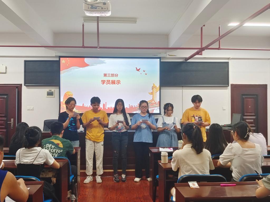 随后,夏谦、郭政宏、卿蓉六位成员分别朗读《给台湾同胞的一封信》,诉说内心渴望祖国统一、两岸团结的愿望;王灿琦、曾芷晴、李敦荣等六位成员对《外交风云》片段进行配音展示,蓝雨璇、何晨、刘超等六位成员进行《盛世中国》诗歌朗诵,在配音和朗诵中感受先辈的热血奋斗,领悟当代青年的责任与担当;叶守晨、周喜如、张政等六位学员分别进行心得分享。最后,王巍锝总结道,新时代是中华民族大发展大作为的时代,也是两岸同胞大发展大作为的时代,并希望各位学员在本次学习中可以有所感悟、有所收获,不忘初心、砥砺前行。