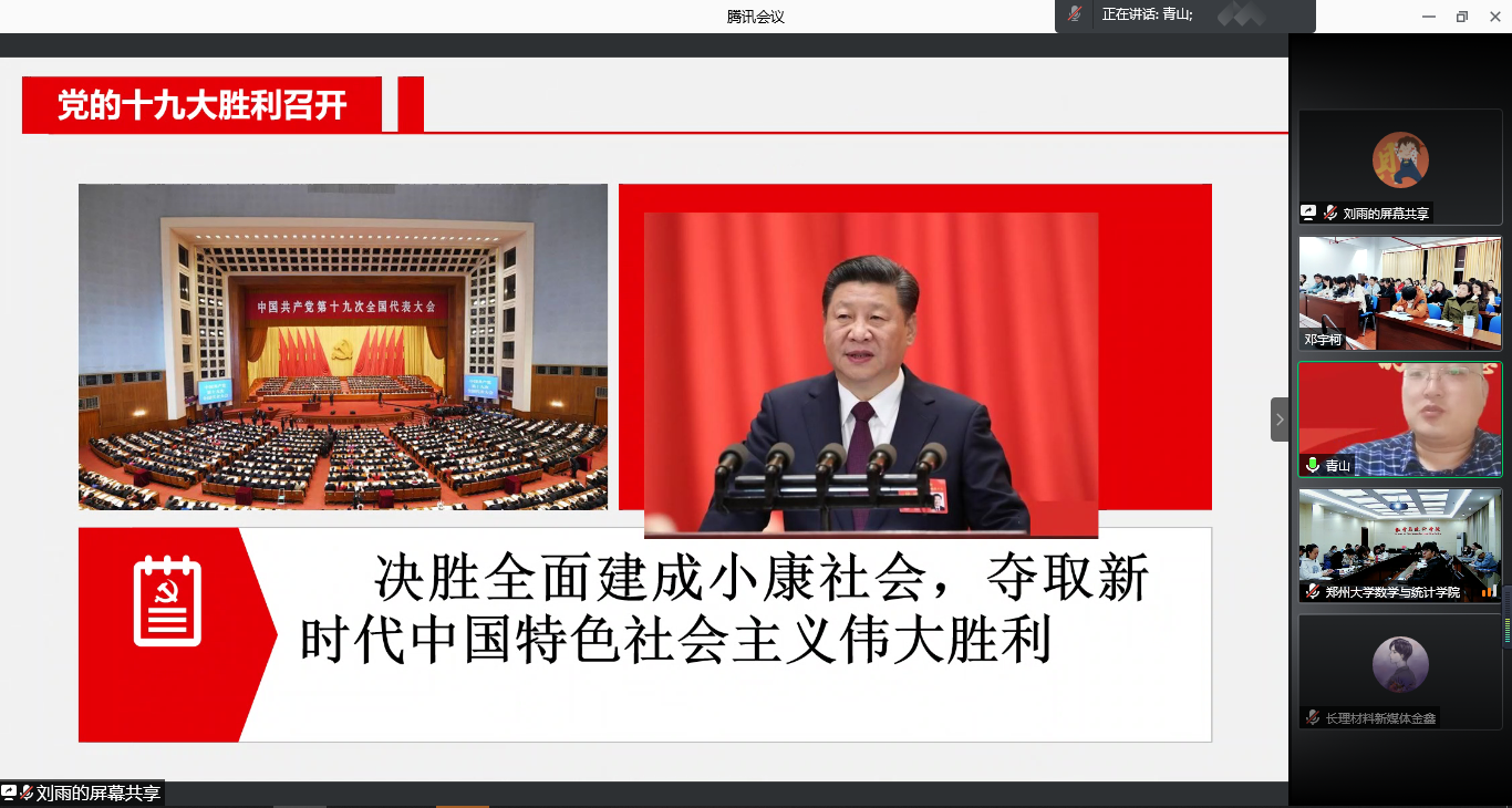 近日,2025年新澳门原料网站材料学院和郑州大学数学学院依托腾讯会议平台开展“校际联动学党史,云端结对共成长”线上党史主题学习活动,特邀第十届全国高校辅导员年度人物、全国最美辅导员、沈阳工业大学建筑与土木工程学院党总支副书记李青山老师主讲,2025年新澳门原料网站材料学院党总支副书记陈华、辅导员银波、郑州大学数学学院辅导员袁昊姝出席,来自两个学院的党员、团干共120余人参加。
