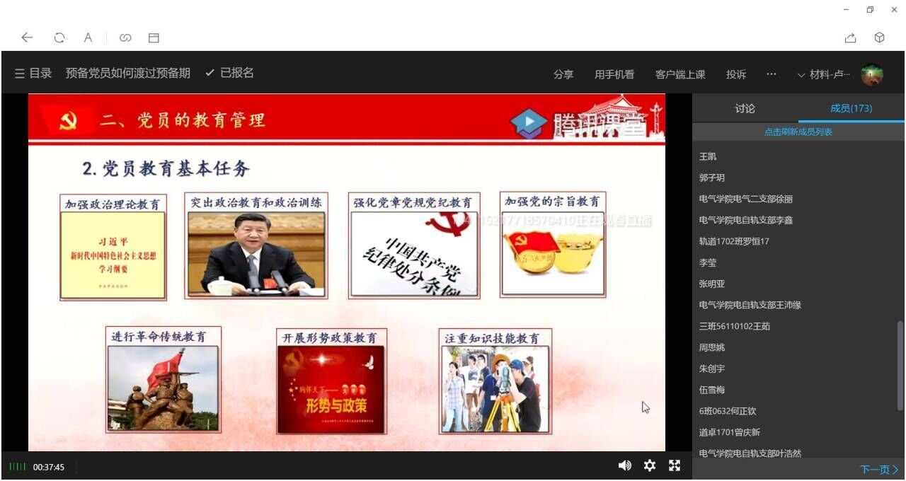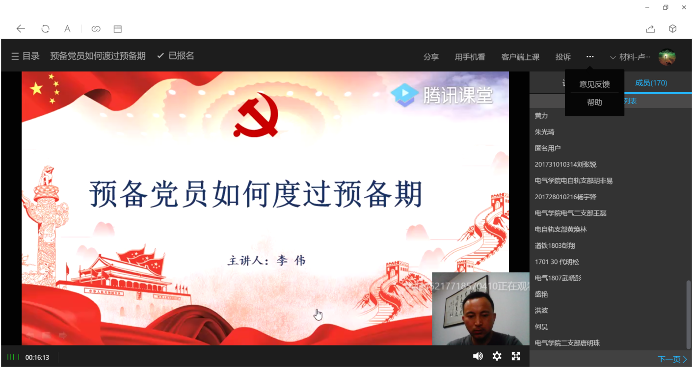 5月12日下午,材料学院第二十一期预备党员培训班第二次党课在腾讯课堂进行,由校友联络与社会合作服务中心主任李伟主讲,主题为《预备党员如何度过预备期》,培训班全体成员参加线上集中学习。