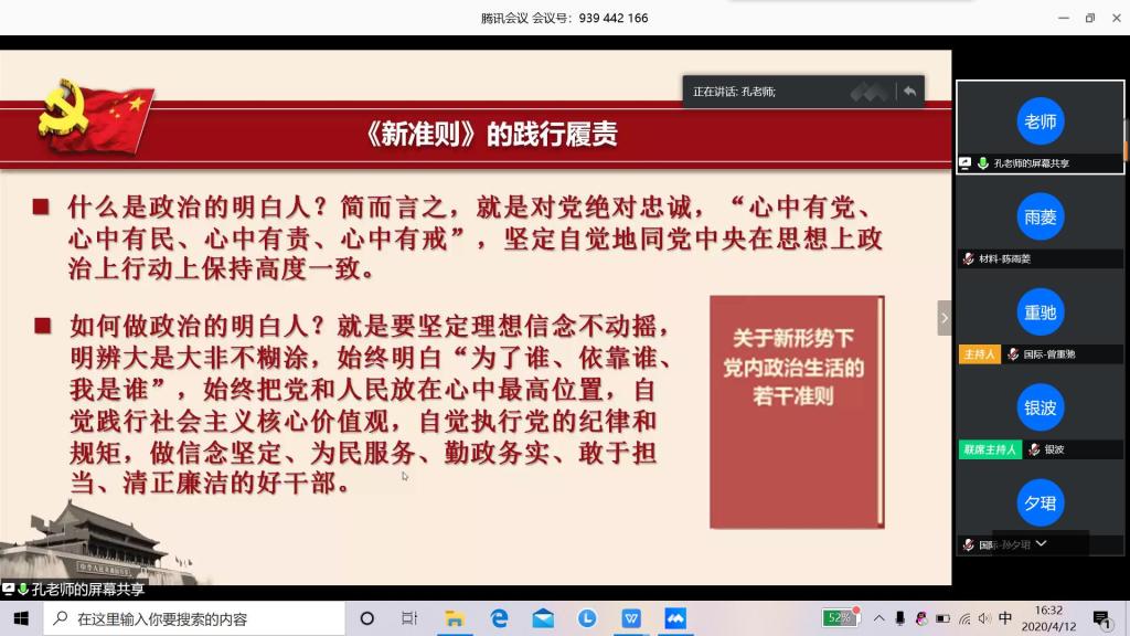 近日,材料学院与国际学院发展对象培训班专题党课通过线上开展,分别由交通学院党委书记孔伟红讲授《关于新形势下党内政治生活的若干准则》和后勤保障中心党委副书记(主持工作)王明彦讲授《党的纪律》。