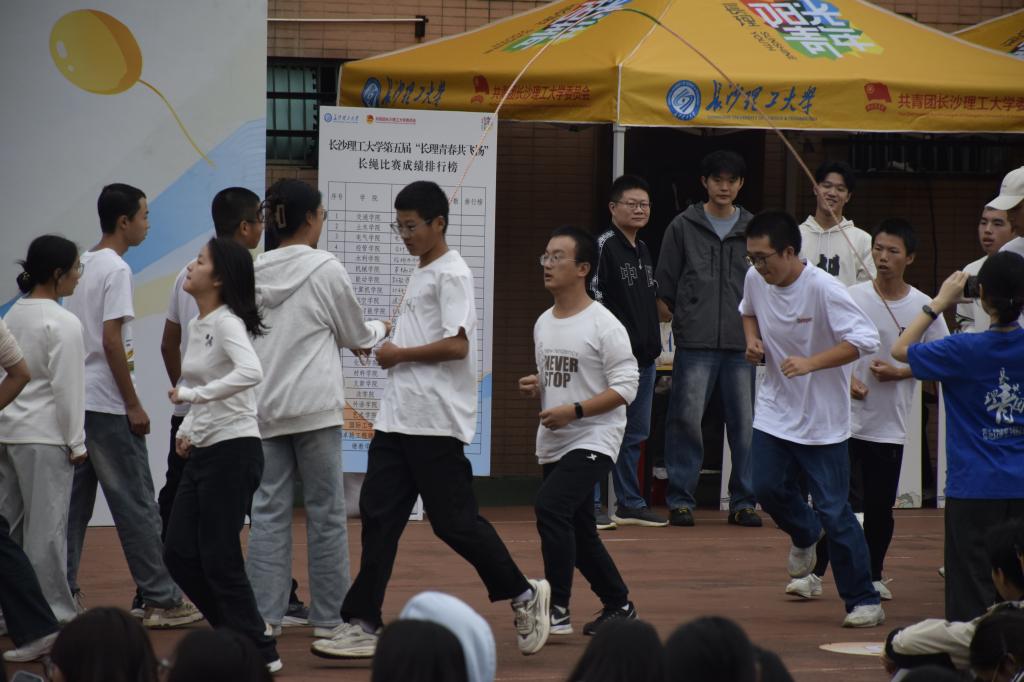 决赛现场氛围热烈非凡,各学院参赛队伍严阵以待,巅峰对决一触即发,竞争格外激烈。随着裁判哨声划破长空,新能源2503班的两名摇绳手迅速进入最佳状态,长绳如银龙腾空、顺势翻飞,划出一道道流畅优美的弧线,“呼呼”的破空声中,尽显千锤百炼的扎实实力。十五名跳绳队员衔接紧密、动作行云流水,前一人刚跃出绳圈,后一人便顺势精准踏入,脚尖轻点地面的“哒哒”声与绳子击地的节奏完美契合,将极高的团队配合度展现得淋漓尽致。