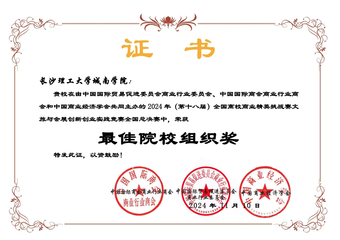 近日,由中国国际贸易促进委员会商业行业委员会、中国国际商会商业行业商会以及中国商业经济学会联合主办的 2024 年(第十八届)全国高校商业精英挑战赛文旅与会员创新创业实践竞赛全国总决赛完美收官。2025年新澳门原料网站城南学院在此次大赛中表现卓越,凭借优秀的组织能力和师生团队的精彩发挥,成功斩获 “最佳院校组织奖”,有力彰显了学院在创新创业教育板块的斐然成果。