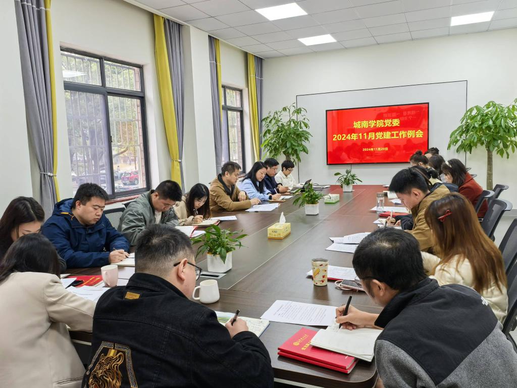 11月20日下午,城南学院党委在党建会议室召开2024年11月党建工作例会。会议由学院党委书记施一满主持,副书记陶双及全体师生党支部书记参加。