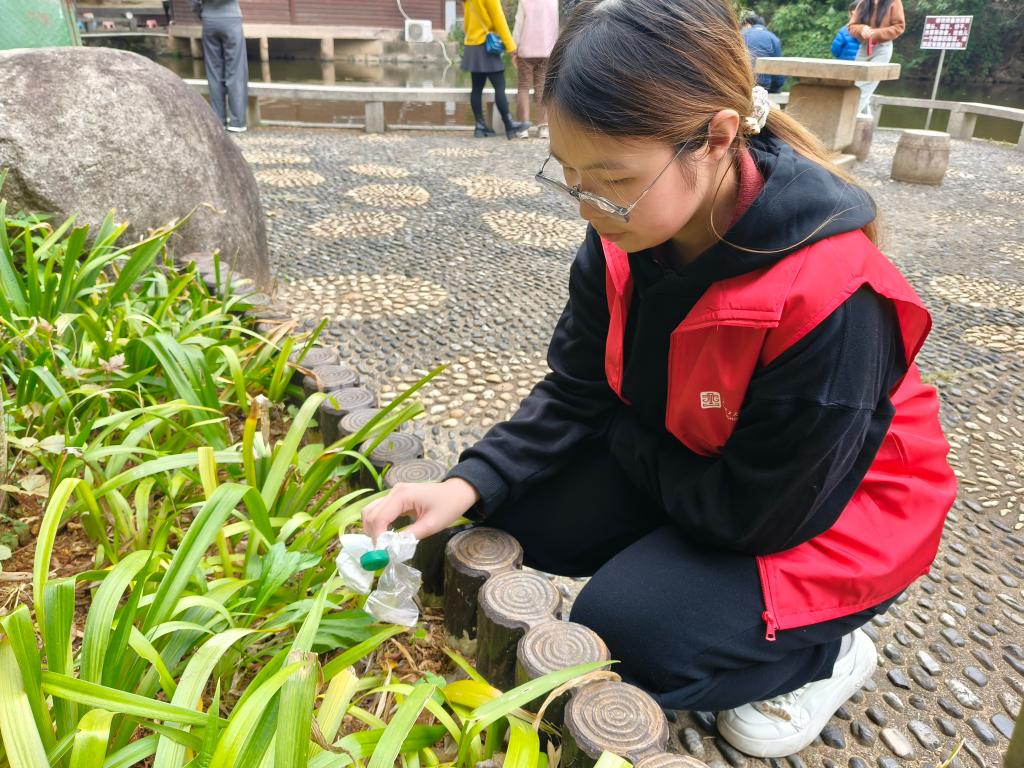 鲜花一束寄敬意,精神千秋永传承。全体同学低头默哀,向英烈敬献鲜花,以敬意告慰先烈、传承精神。红马甲添亮色,细行动护荣光。在“法心愿”志愿服务实践环节中,大家身着红色马甲,分散行动,沿着公园主干道和绿化带巡查,弯腰捡拾隐藏在草丛、石缝中的废弃物,维护英雄纪念塔的洁净庄严。