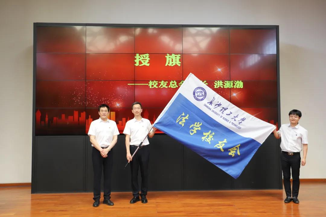 洪源渤为法学校友会会长、常务副会长等常务理事和理事颁发聘书,并为法学校友会进行授旗。他希望法学校友会从今天开始要开启有计划、有组织运作的新征程,同时,期待法学校友会作出新作为、新贡献。