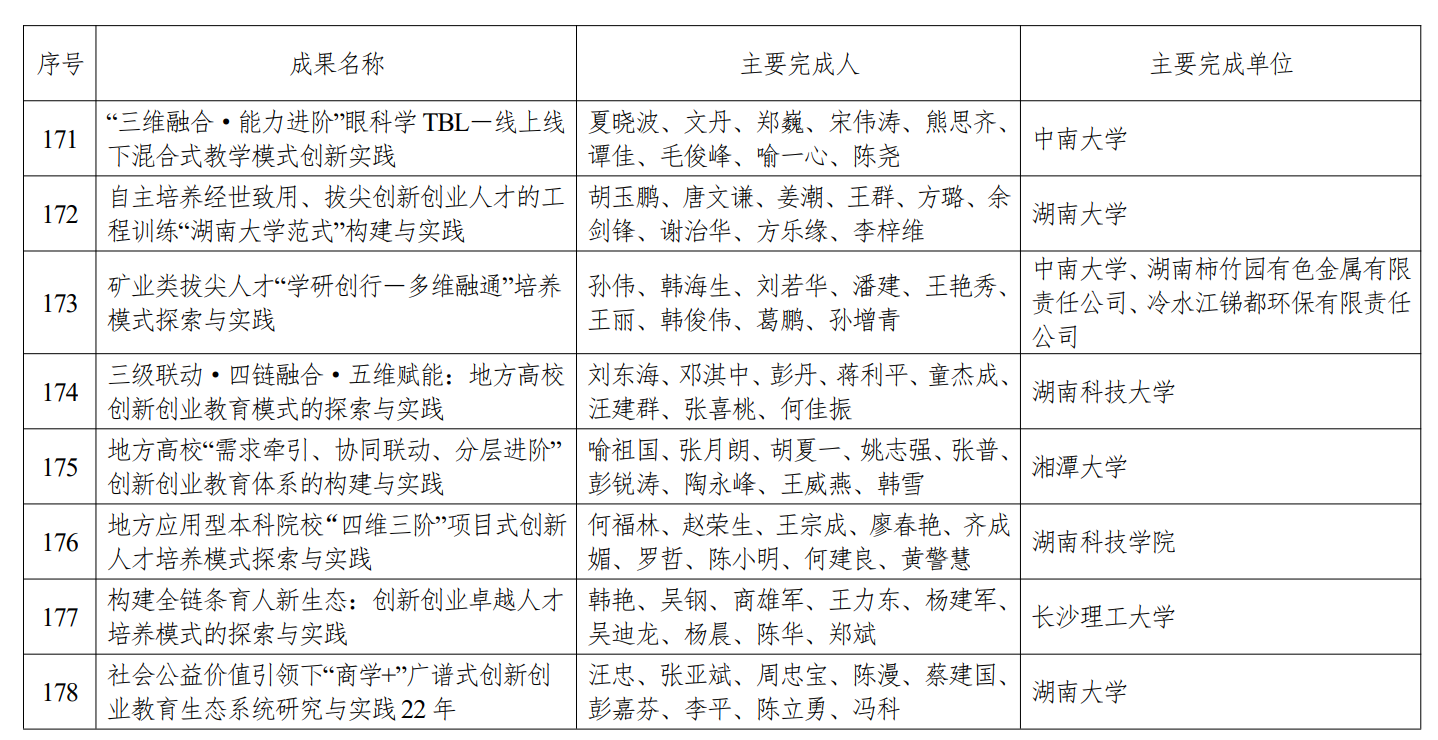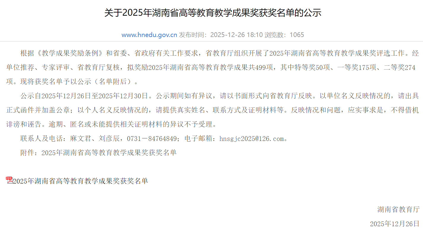 2025年12月,湖南省教育厅公布了湖南省高等教育(本科)教学成果奖获奖名单,由我院韩艳、吴钢、商雄军、王力东、杨晨、陈华等教师申报的教学成果——“构建全链条育人新生态:创新创业卓越人才培养模式的探索与实践”荣获湖南省一等奖,充分彰显了我院在教育教学改革和人才培养方面的扎实成效与持续进步。