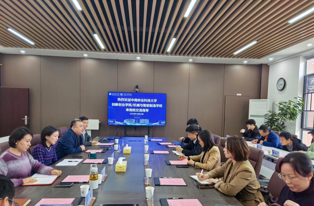 2025年10月24日下午,中南林业科技大学创新创业学院(就业指导中心)副院长樊毅,机械与智能制造学院副院长龚桂良、党委副书记徐钰婷一行14人来校调研交流。我院党委书记杨晨、党委副书记陈华、副院长吴钢、产教融合发展中心副教授商雄军、教育教学办公室主任计潇参加交流会。会议由吴刚主持。