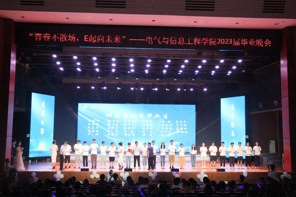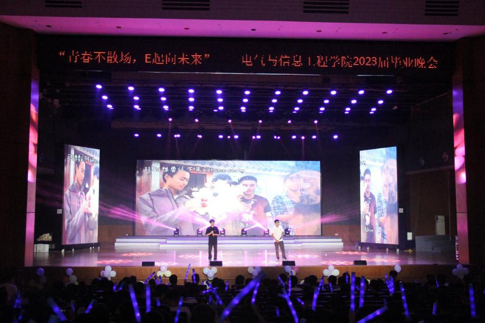 晚会在洋溢着青春热情的主持人致辞中拉开序幕。歌曲《南方》《songf》展现着少年的意气风发和昂扬斗志,以令人耳目一新的风格掀起全场一片高潮;文工团舞蹈《OMG》用青春的活力与激情点燃了整个舞台,青春的旋律在大会堂回荡;昨日方初见,转眼即别离,光影剧《时光不辞而别》用朦胧的光与影诉说着青春是一场盛大的邂逅。节目过程中,电气学院领导和老师们以视频的形式为毕业生们送上期待与祝福,使毕业生们再次感受到学院大家庭的温暖。晚会还为辛勤园丁及省级优秀毕业生进行颁奖,对老师的无私奉献和学生的坚定自强表达了赞扬与肯定。星子闪烁着眷念,青鸟低吟着离歌,晚会在团学大合唱《凤凰花开的路口》中落下帷幕。