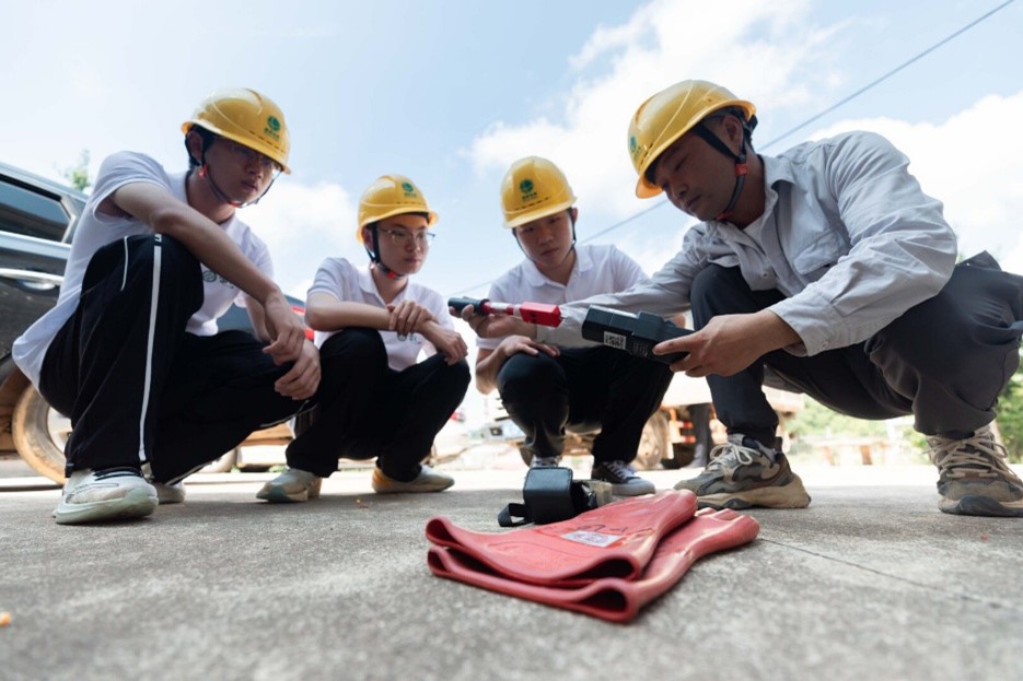 现场被安全栏杆围起,“止步,高压危险”“在此工作”的标示牌醒目矗立,供电师傅们身着全套工作服、头戴安全帽,严格按规程作业周师傅特意将实践队员引至一旁,细致讲解安全工具的使用要点:“验电笔分0.4kV和10kV两种,核心是精准检测带电状态;绝缘手套检查要卷成密闭空间,挤压后贴近耳边听是否漏气,一丝疏忽都可能出危险。” 演示中,工具的规范使用与师傅的严谨态度形成鲜明示范。
