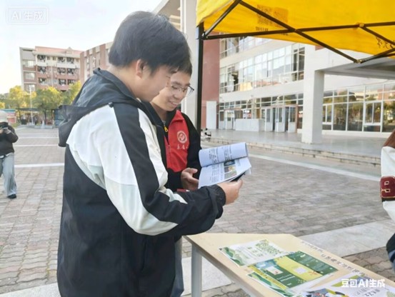 汀香园前坪的摆点处,蓝丝带志愿团的帐篷早早支起,志愿者们正忙着整理宣传、摆放科普展板,为宣传活动做好准备。“同学,了解一下我们的‘绿色卫士’理念吧!”志愿者们笑着递出宣传册,热情招呼着往来同学。这份册子里不仅通俗解读绿色生态环保理念,更清晰阐释国家生态治理战略。这不仅仅是一次简单的发放,更是一次心与心的交流,用传单搭起桥梁,让青年主动践行环保责任。