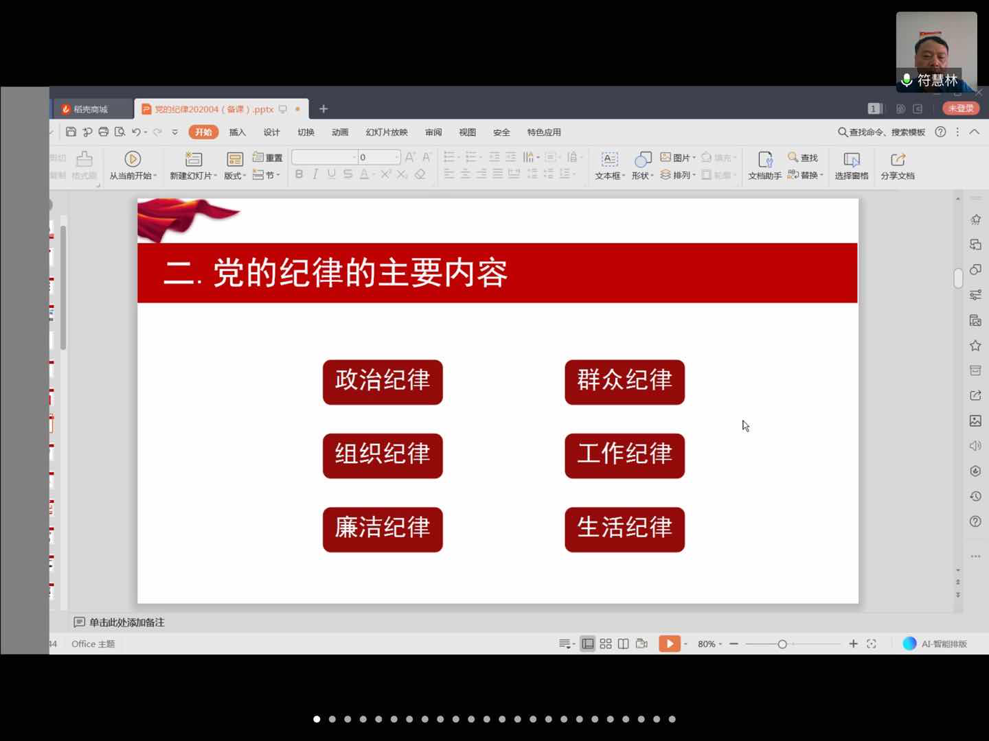 《关于新形势下党内政治生活的若干准则》专题由校友联络专干甘为讲授。甘为以“准则、政治生活、新形势”三个关键词对《新准则》的背景进行介绍,从坚定理想信念、坚持党的理想信念等12个方面对《新准则》的具体内容进行讲解,并强调作为一名学生党员发展对象要不断地加强学习、严格自律,不因为疫情在家而放弃自己的学习。
