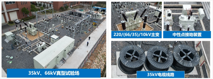 35kV/66kV真型试验系统包括:1台5000kVA 220/66/35/10kV油浸式变压器、66kV配电装置、35kV配电装置、66kV消弧线圈、66kV主动降压消弧设备、10kV电抗器、预制舱、3公里35kV电缆、故障模拟装置;中性点接地方式包括:不接地、消弧线圈接地及经电压源接地。