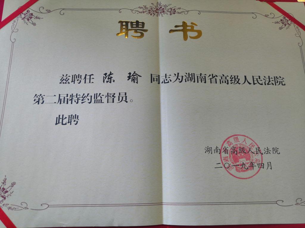 为认真落实中央和省委关于加强党外代表人士队伍建设的要求,加大优秀党外中青年代表人士的培养锻炼力度,经省委统战部、省高级人民法院联合考察,我校党外知识分子联谊会会长、国际学院院长、无党派人士陈瑜受聘为湖南省高级人民法院第二届特约监督员,聘期三年。
