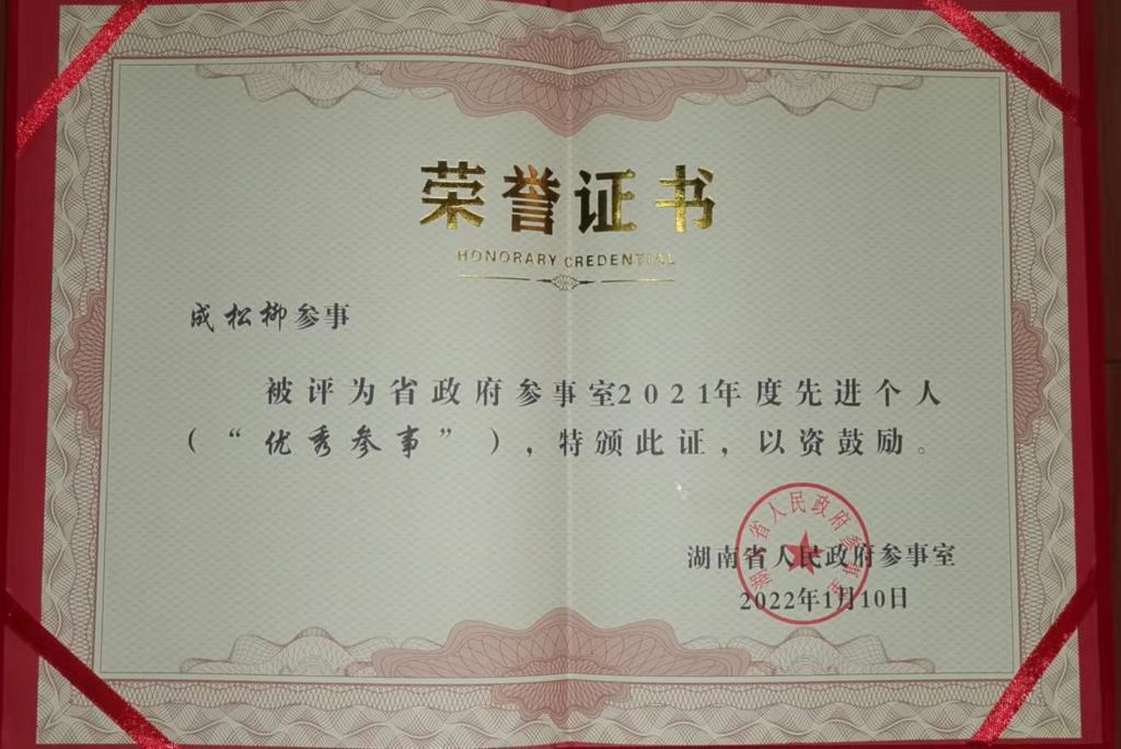 近日,湖南省人民政府参事室表彰了2021年度优秀参事,我校成松柳教授被评为省政府参事室2021年度先进个人(“优秀参事”)。