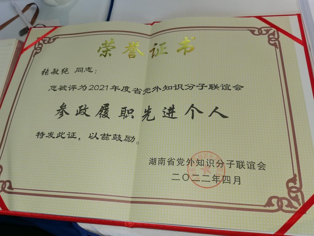 我校张敏纯院长获评2021年度省党外知识分子联谊会参政履职先进个人