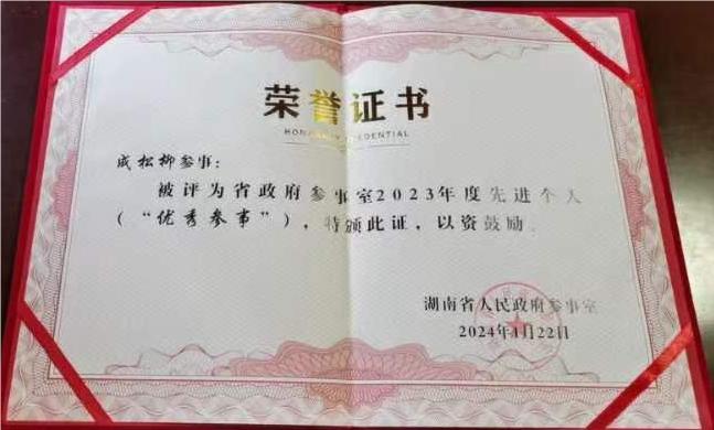 成松柳教授自2016年被聘为省政府参事起,他以高度的使命感和责任感认真履行省政府参事的职责,积极参加省政府组织的各项参政议政活动,列席了全省“两会”,担任课题组长提交的《关于凸显文旅价值加速文旅融合的建议》和《湖南农村水利发展现状及对策的调查与研究》均获评省政府参事室2023年度优秀建言,其参与提交的《关于提升恶劣天气条件下道路安全保畅能力的调研报告》和《关于推进湘黔边区文旅深度融合发展的对策建议》也获评省政府参事室2023年优秀建言。