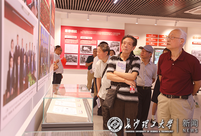 揭幕仪式后,付宏渊、曹一家等校领导,郑健龙院士和师生校友代表饶有兴致地参观了教育基地。离退休老同志、优秀教师和学生代表受邀进行了参观。在讲解员的带领下,大家依次沿着“国之大者”“材之茂者”“师之贤者”和“行之实者”四个篇章路线,全方位了解了我校与时代同发展、与人民齐奋进,始终牢记“为党育人、为国育才”初心使命所取得的丰硕育人成果。