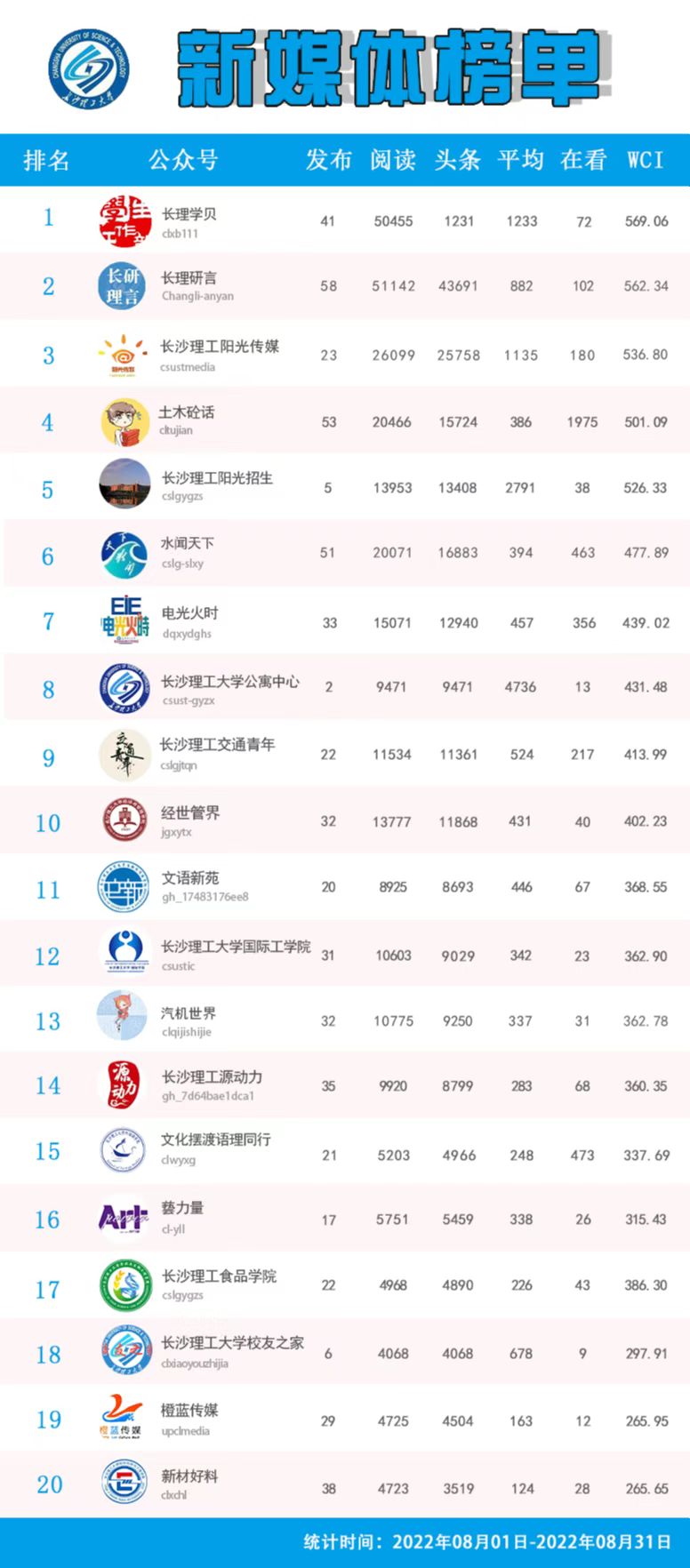 校属单位微信公众号排名(2022年8月)