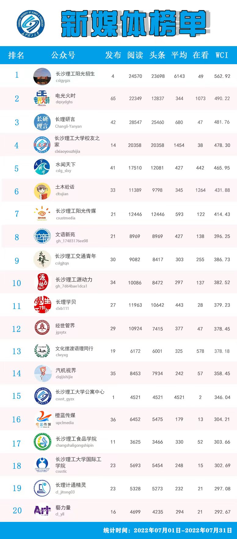 校属单位微信公众号排名(2022年7月)