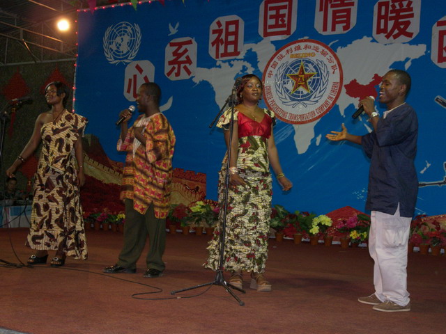 4月4日,以北京军区副参谋长武燕生少将为首的代表团抵达利比里亚首都蒙罗维亚慰问我国驻利维和部队官兵,我校孔子学院师生一行10人应邀到运输大队军营参加文艺晚会。孔院合唱团的演员们在晚会上成功地表演了情歌对唱《敖包相会》、女声独唱《映山红》和非洲风情舞三个精彩节目,赢来阵阵热烈掌声和喝彩声。部队首长在接见演员时连声夸赞孔院师生说:“唱得好!教得好!让中华文化发扬光大!”