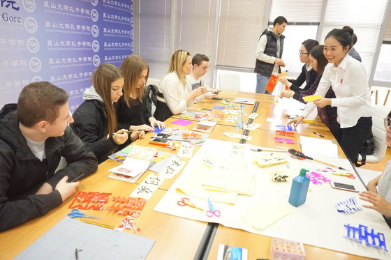 参观活动开始,中方院长邓嵘和外方院长米莱娜分别从黑大孔院建院伊始到目前的发展状况向参观学生做了介绍。随后,孔院老师们对孔院的主要项目包括奖学金、夏令营、汉语桥等活动给学生做了详细介绍。中国书法活动和剪纸也引起了参观学生的浓厚兴趣。学生们现场临摹汉字,感受中国书法的韵味和魅力。