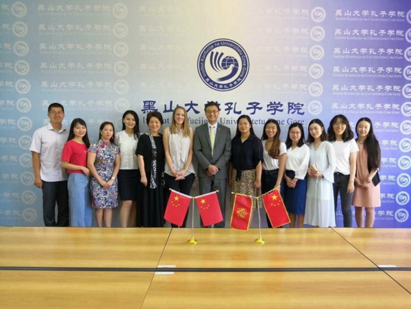 随同考察的有政务参赞华亚芳女士、政治部主任于希女士,访问结束后,刘晋一行与黑山大学孔子学院全体成员进行合影留念。