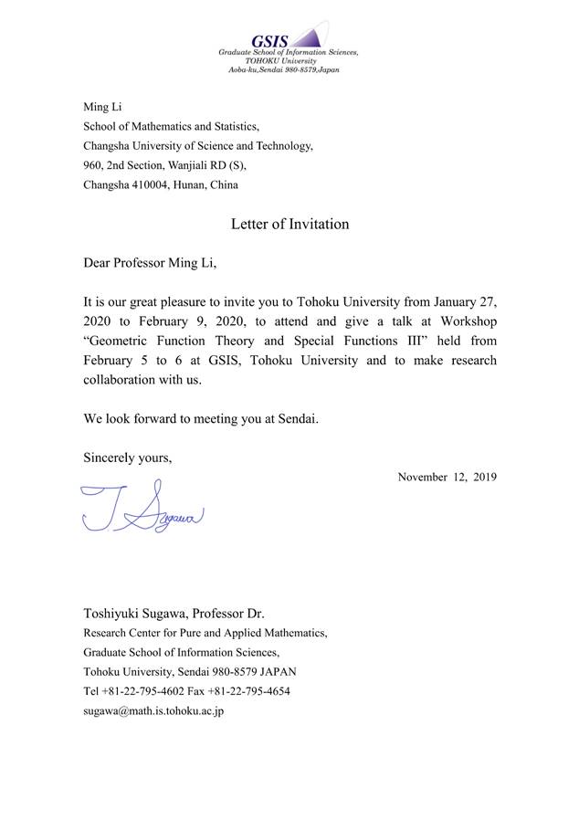 诚邀您于2020年1月27日至2020年2月9日到日本东北大学进行访问,就之前和之后的研究合作进行讨论。并诚挚邀请您在我校即将在2月5日至6日举办的“几何函数理论于特殊函数第三次会议”上做报告。