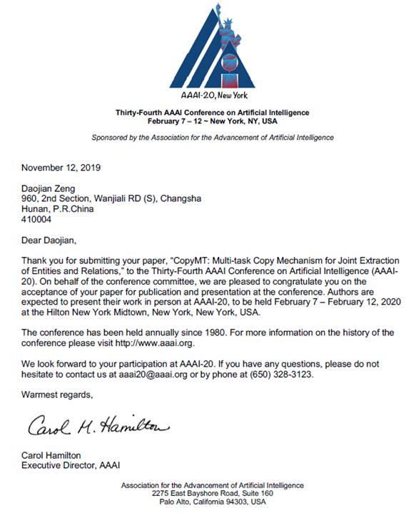 感谢您将论文“ CopyMT:基于多任务复制的联合提取实体和关系”提交给第三十四届AAAI人工智能会议(AAAI-20)。 我们谨代表会议委员会向您表示祝贺,恭喜您接受论文发表并在会议上发表。 我们期望作者将在2020年2月7日至2月12日在美国纽约希尔顿纽约中城举行的AAAI-20会议上介绍自己的作品。
