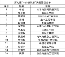 经学生自主报名,评委老师审核评定,现将入围第七届“中外演说家”大学生中英文演讲比赛决赛的学生名单公示如下: