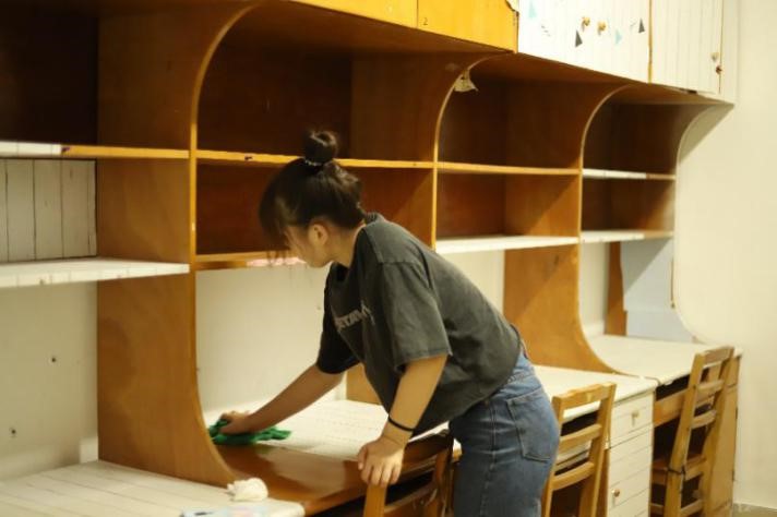 考虑宿舍长时间未通风的情况,志愿者们在打扫卫生的同时也给各个宿舍进行通风透气,志愿者们不怕脏不怕累,通力协作,从擦拭桌椅到清洁地板等,不留下死角,每一个志愿者都积极投入到打扫中,热火朝天地忙碌着。