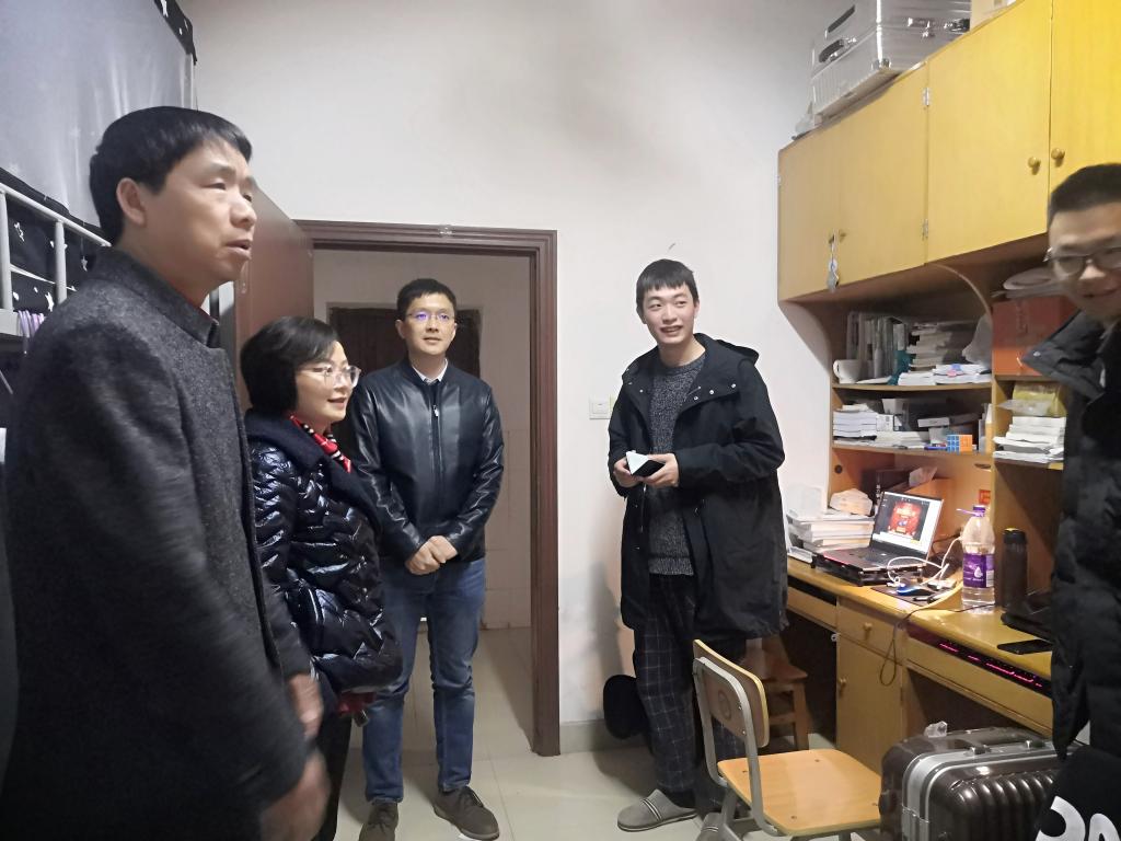 2020年2月28日,国际学院党总支书记刘安生、院长陈瑜、党总支副书记兼副院长张锐,以及学工办老师深入学院学生寝室,看望学生。