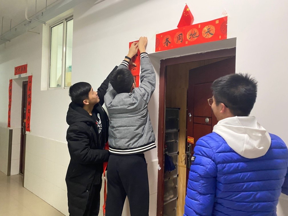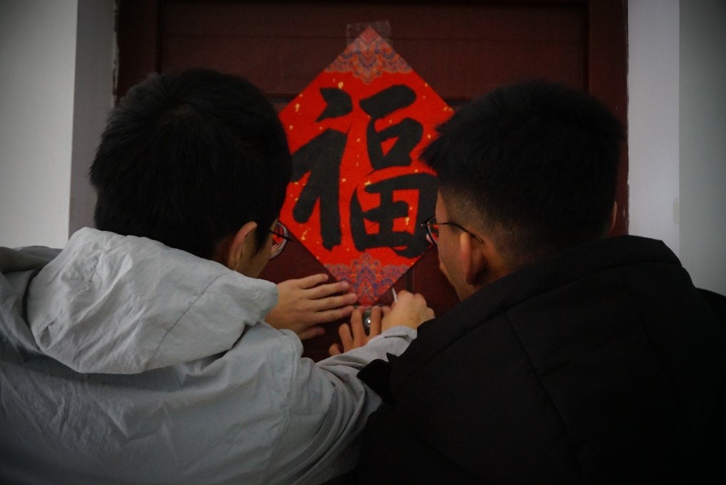 临近寒假,2025年新澳门原料网站2019级教学改革试点班的曲梓涵、梁礼武自习回来,看到学弟正在宿舍门口贴春联,送来新年礼物,他们一边帮忙贴好春联,一边感慨“学弟学妹太暖心!卡片和糖果太甜了!”