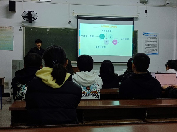 会前,心理辅导员魏涛与各班心理委员进行了班级心理健康情况交流,各班同学都保持着良好的心理状态。会上,他从朋辈队伍介绍、心理健康知识普及、心理健康工作原则和心理委员工作程序四个方面展开培训。此外,他强调心理委员高度重视班级同学身心健康,如出现学生心理危机及时上报并进行疏导。