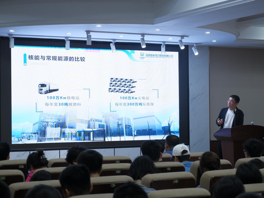 张帆以中国核工业发展史为引,向“青马班”学员着重强调了核工业的重要性。随后又向同学们介绍了核电原理及知识点,核电厂的发电流程以及部分关键技术。其次他阐述了核能、核技术的广泛应用以及核工业的安全保障,同时向同学们提倡要理性认识辐射对人体以及环境的影响。随后落点于双碳目标,将中、外发电技术进行对比,强调我国对于积极有序安全发展核电需求的紧迫性,并以中核集团为代表向学员介绍核电与新能源产业布局。最后,张帆向学员们阐述了“两弹一星”精神的重要性并倡导同学们传承新时代“两弹一星”精神。