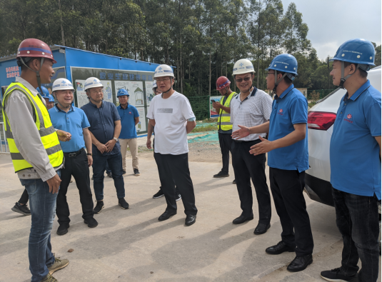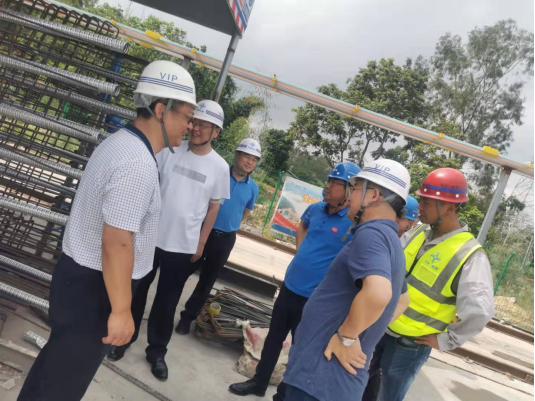在浦清高速公路第四标段3#梁场,谈校长一行考察了该项目梁板的预制,并与参建单位中校友等进行了交流,详细了解项目建设、校友工作生活等情况。在南流江大桥,华南公司浦清项目JL-3总监办负责人邹宏杰、中交一航局四标段负责人梁星介绍了桥梁建设情况。听到我校监理单位、检测单位在施工过程中积极协助施工单位在确保施工质量、安全的情况下优化施工工艺、加快了施工进度,谈校长充分肯定了监理单位及检测单位的工作,并表示,校办企业就是要充分发挥学校科技创新和人才集聚优势,积极为业主和施工单位排忧解难、做好服务。