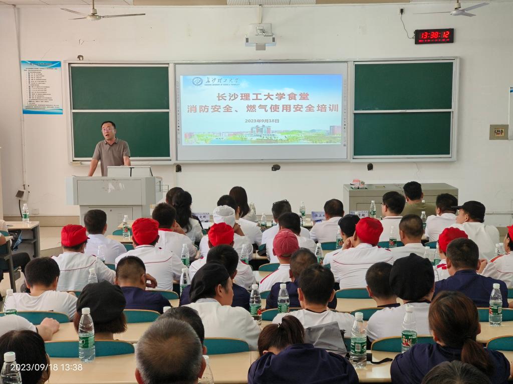 9月18日下午,后勤中心餐饮服务部在云塘校区综合教学楼B101组织开展消防安全暨燃气使用安全专题培训。湖南君消消防安全服务中心主任教官梁绩超、湖南省计量检测研究院报警器室检定员刘文彬应邀主讲。后勤中心党委书记王明彦、副主任邓应军参会。餐饮服务部班子成员、自管和托管食堂管理人员及一线员工150余人参加了培训。会议由餐饮服务党支部书记杨李主持。