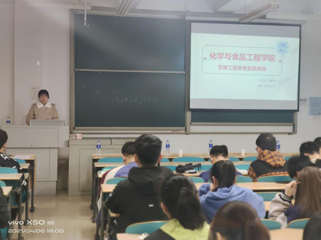 第四位宣讲嘉宾是文李,她列举了生物工程专业各个方向的就业范围,鼓励同学们认真扎实学好专业课程知识,找到自己喜欢的方向并坚持钻研下去,在自己喜欢的岗位上发光发热,达到自己阶段性的人生目标。接着是蒋雪薇,从客观角度说明了生物工程专业对国家发展的重要作用及发展前景,从实用性、趣味性方面吸引同学们认真学习文化知识,实现自己的人生价值。最后一位宣讲嘉宾是舒孝顺,他从新冠疫苗的研发引入,讲述了生物制药对未来发展的重要性,表明生物工程是与医药息息相关的朝阳产业,并从就业和考研两方面证实了生物工程专业为我们提供的广阔发展空间。