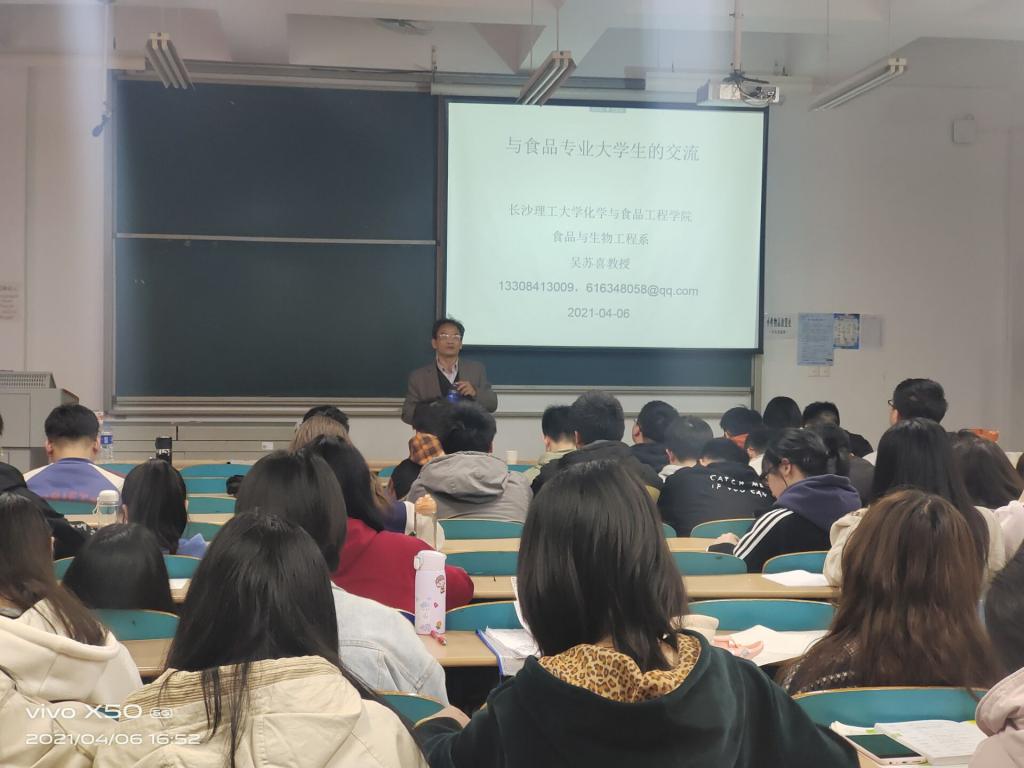 首先,许宙从培养目标,专业特色,专业师资力量展开介绍了食品科学与工程专业。以最近的315沃柑事件引出食品安全问题,并就食品安全检测专业的核心课程,课程目标进行简要概述。接下来,李向红从学科简介,学科方向,人才培养三方面介绍了我校食品科学与工程专业的优势,并着重介绍了学科主要研究方向,分享了代表性毕业生的发展方向。下一位是吴苏喜,他以幽默风趣的语言风格,通过与同学们面对面的交流,从我们大学生为什么要学习?我们专业是干什么的?我们需要学习什么?有什么优势?等四个方面讲述了他对食品科学与工程专业的见解。